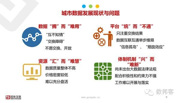 我們要解決的問(wèn)題有哪些?最重要的問(wèn)題是我們目前城市發(fā)展現(xiàn)狀里的數(shù)據(jù)"擁而難用"。我們數(shù)據(jù)互不執(zhí)行,交換障礙,不愿意交換,也不愿意開(kāi)放,為什么?各個(gè)部門(mén)都認(rèn)為這個(gè)數(shù)據(jù)是我的,怎么開(kāi)放出來(lái)?但是城市級(jí)數(shù)據(jù)資源,大家等到通過(guò)分享能夠獲得價(jià)值的時(shí)候都會(huì)愿意拿出來(lái)。數(shù)據(jù)"擁"而"難用",平臺(tái)"統(tǒng)"而"不通",資源"匯"而 "難慧",這個(gè)數(shù)據(jù)質(zhì)量整體不高,利用價(jià)值比較低,難以充分的盤(pán)活;體制機(jī)制"興"而 "難新",目前尚未出臺(tái)大數(shù)據(jù)的法律法規(guī),積極性和約束力都不強(qiáng),所以它的動(dòng)力機(jī)制不夠,導(dǎo)致有些工作難以解決這些問(wèn)題和現(xiàn)狀。