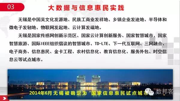 大數(shù)據(jù)與信息惠民實(shí)踐,我們到底怎么考慮和怎么做的?就是切入我們無(wú)錫了,本來(lái)我說(shuō)講的時(shí)候不想再講無(wú)錫了,講的太多了,但是講到實(shí)踐不得不拿無(wú)錫作為案例來(lái)跟大家共享。無(wú)錫有自身的特點(diǎn),它是中國(guó)文化發(fā)源地、民族工商業(yè)發(fā)祥地、鄉(xiāng)鎮(zhèn)企業(yè)發(fā)跡地、半導(dǎo)體和微電子的發(fā)軔地、物聯(lián)網(wǎng)發(fā)起地、云計(jì)算發(fā)端地,它也是國(guó)家傳感創(chuàng)新示范區(qū),國(guó)家云計(jì)算創(chuàng)新服務(wù)、國(guó)家智慧城市、國(guó)家智慧旅游的智慧城市等等,近20個(gè)國(guó)家級(jí)試點(diǎn)是落在無(wú)錫的。這對(duì)推進(jìn)無(wú)錫智慧城市建設(shè),包括大數(shù)據(jù)產(chǎn)業(yè)發(fā)展都是營(yíng)造了一個(gè)良好氛圍。無(wú)錫的大數(shù)據(jù)和信息惠民怎么來(lái)做?我想一句話,叫思路決定出路,創(chuàng)新引領(lǐng)未來(lái)。所以我想展開(kāi)六個(gè)方面簡(jiǎn)單地說(shuō)一下: