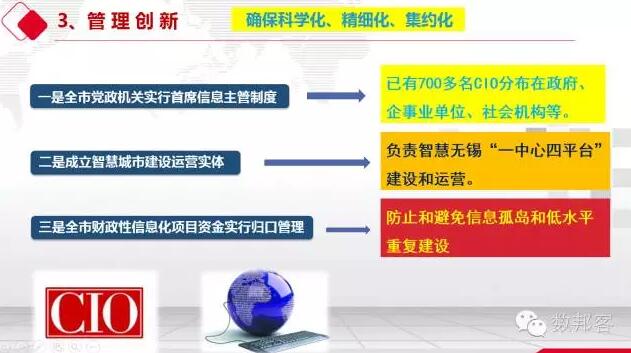 第三,管理創(chuàng)新。這就要求我們確保管理的科學(xué)化,精細(xì)化跟節(jié)約化,在這個(gè)方面為了確保我們管理上到位,我們也是三點(diǎn)措施:全市成立了黨政機(jī)關(guān)的首席信息化制度;成立了智慧城市建設(shè)運(yùn)營(yíng)實(shí)體,實(shí)際當(dāng)中它有很多內(nèi)容和要求;對(duì)財(cái)政性信息化項(xiàng)目資源進(jìn)行歸口管理,要不要建,什么時(shí)候建,建多大規(guī)模,這個(gè)部門(mén)必須說(shuō)的算。