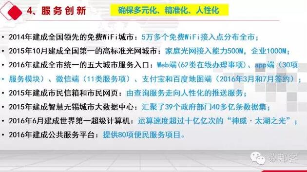 第四,服務(wù)創(chuàng)新,即確保多元化、精準(zhǔn)化、人性化。2014年建成全國(guó)領(lǐng)先的免費(fèi)WIFI發(fā)布,在2015年建成了全國(guó)第一的高標(biāo)準(zhǔn)的光網(wǎng)城市,2016年建成了全市統(tǒng)一的五大城市服務(wù)入口,有這么多服務(wù),信息會(huì)惠民?這就要求我們必須要有服務(wù)的端口。所以我們服務(wù)端口包含了Web端,現(xiàn)在提供了62類(lèi)在線辦理事項(xiàng);App端有30項(xiàng)服務(wù)模塊;微信端提供了11類(lèi)服務(wù)項(xiàng);以及支付寶和百度地圖端,這樣的話使得老百姓更加的方便?;A(chǔ)設(shè)施是基礎(chǔ),沒(méi)有這樣的基礎(chǔ),要說(shuō)城市信息惠民有多好,這是句空話。所以我們把基礎(chǔ)設(shè)施建設(shè)作為信息惠民,以及大數(shù)據(jù)獲取、大數(shù)據(jù)處理分析跟應(yīng)用的一個(gè)重要的抓手。2015年我們給每個(gè)市民建成了市民信箱和市民網(wǎng)頁(yè),由查詢(xún)服務(wù)走向人性化的推送服務(wù)。2015年我們建成了無(wú)錫的城市大數(shù)據(jù)中心,其實(shí)我們也就提前部署了這個(gè),而不是在討論,我已經(jīng)建成了。匯聚全市39個(gè)政府部門(mén)40多億條數(shù)據(jù)集。光有城市數(shù)據(jù)是不完整的,光有互聯(lián)網(wǎng)數(shù)據(jù)也是不完整的,光有行業(yè)數(shù)據(jù)也是不完整的,三方面數(shù)據(jù)加起來(lái)了才能說(shuō)數(shù)據(jù)相對(duì)完整。2016年我們建成了世界第一的超級(jí)計(jì)算機(jī),就是100P的,十億億次的運(yùn)算速度。
