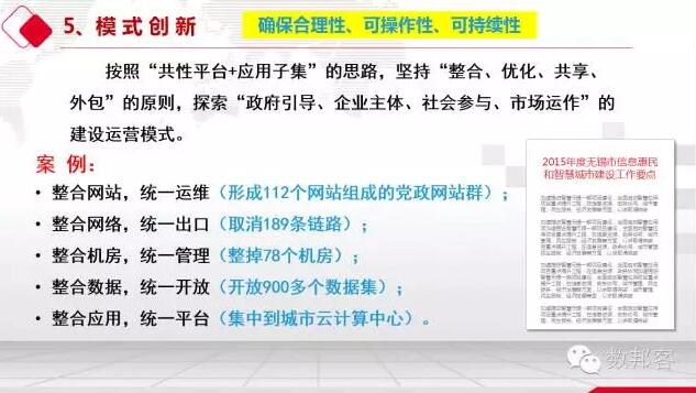 第五,模式創(chuàng)新。我們按照共性平臺(tái)加應(yīng)用子集的思路,堅(jiān)持整合、優(yōu)化、共享、外包的原則,探索政府引導(dǎo)、企業(yè)主體、社會(huì)參與、市場(chǎng)運(yùn)作的建設(shè)運(yùn)營(yíng)模式。整合網(wǎng)站,統(tǒng)一運(yùn)維,網(wǎng)絡(luò)需要整合,統(tǒng)一出口;整合機(jī)房,統(tǒng)一管理,我們整掉了所謂黨政部門(mén)的機(jī)房;整合數(shù)據(jù),統(tǒng)一開(kāi)放,開(kāi)放90多個(gè)數(shù)據(jù)集;整合應(yīng)用,統(tǒng)一平臺(tái),就是把整個(gè)政府相關(guān)的對(duì)社會(huì),對(duì)企業(yè)、個(gè)人的應(yīng)用整合到一個(gè)平臺(tái)上,我們放到城市云計(jì)算中心。