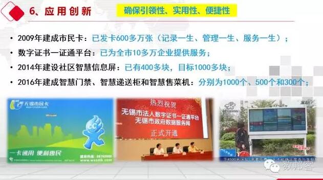 第六,應(yīng)用創(chuàng)新。應(yīng)用創(chuàng)新的案例太多了,一般在場(chǎng)合中我都不太講應(yīng)用的,因?yàn)檎鲆龑?dǎo)就好,很多的應(yīng)用都是社會(huì)化的。引幾個(gè)案例,2009年建立了市民卡,它是記錄一生、管理一生、服務(wù)一生的,它獲得了2009年中國(guó)信息化成就獎(jiǎng),是整個(gè)應(yīng)用創(chuàng)新的典型案例。因?yàn)閼?yīng)用創(chuàng)新要保證我們應(yīng)用的引領(lǐng)性、實(shí)用性和便利性。我們的數(shù)字證書(shū)一整套平臺(tái),這個(gè)也是全國(guó)領(lǐng)先的,現(xiàn)在已經(jīng)有十多萬(wàn)企業(yè)在上面應(yīng)用了,也就是不要每一個(gè)東西都要給企業(yè)發(fā)一個(gè)數(shù)字證書(shū),現(xiàn)在任何數(shù)字證書(shū)在我們平臺(tái)上都是通用的,每一個(gè)企業(yè)一張身份認(rèn)證就可以了。2014年建成了社區(qū)智慧信息屏,我們的目標(biāo)是一千塊。2016年建成了門(mén)禁系統(tǒng)、智慧遞送柜和智慧售菜機(jī),看名字很簡(jiǎn)單,但是確確實(shí)實(shí)放在了社區(qū)為老百姓提供了便捷服務(wù)。