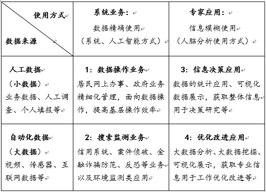 將兩類數(shù)據(jù)來源(人工數(shù)據(jù)、自動(dòng)化數(shù)據(jù))與兩類應(yīng)用(系統(tǒng)業(yè)務(wù)模式、專家應(yīng)用模式)組合起來,即可得到四種數(shù)據(jù)的收集與使用狀況: