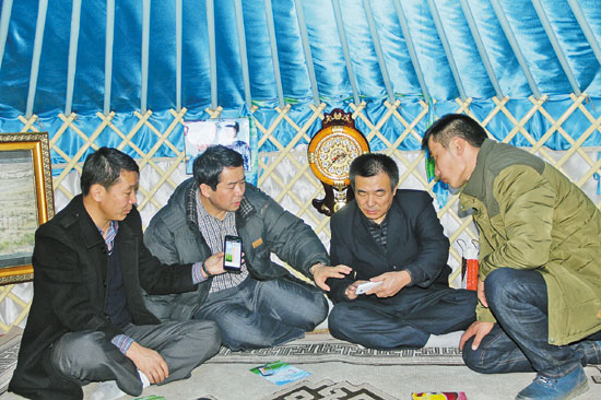 信息服務部門人員現(xiàn)場為農牧民演示如何使用蒙古文手機