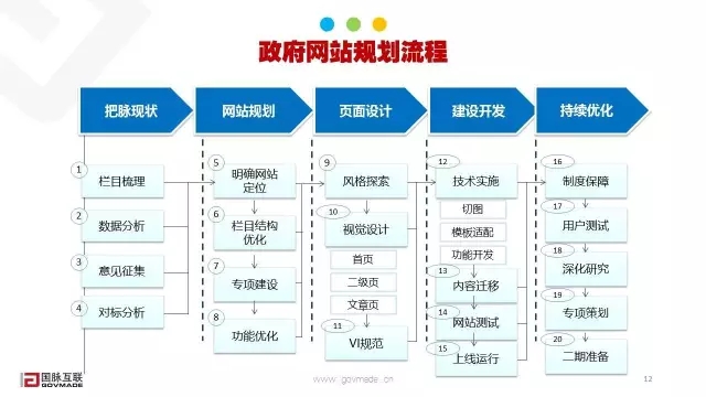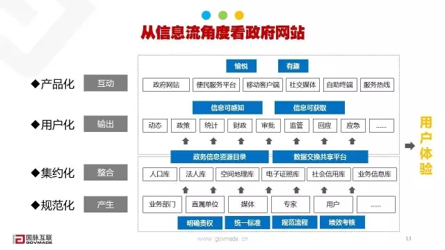 上圖是政府網(wǎng)站規(guī)劃的基本流程,可以看到每一個任務都可以分解成非常細致的具體的工作,事實證明將前期基礎工作做扎實來強化頂層設計能夠使后期的實施工作更順利。政府網(wǎng)站建設不是簡單的這樣的直線型的模式,而是一個循環(huán)往復的過程,在這個過程中任何一個點都是可以當做起點的。從互聯(lián)網(wǎng)+政務的角度來看待政府網(wǎng)站,往往是從服務的視角出發(fā),如果從信息流的角度來看待政府網(wǎng)站建設,那基本也包括信息的產(chǎn)生、整合、輸出還有互動四個板塊。