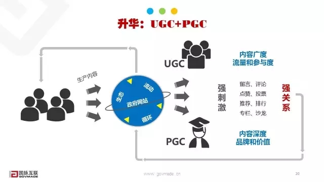 UGC是用戶生成的內(nèi)容,PGC就是專業(yè)人士生產(chǎn)的內(nèi)容,強化這二者的結(jié)合其結(jié)果就是能夠使我們剛才所說的信息互動的層面和信息產(chǎn)生的層面進行有效的連接,促進網(wǎng)站整個信息的流動和循環(huán)。UGC主要是負責內(nèi)容的廣度,是貢獻流量和用戶的參與度;PGC維持的是內(nèi)容的深度。通過PGC樹立網(wǎng)站的品牌創(chuàng)造價值,可以說這二者是缺一不可的。在整個網(wǎng)站的互動的過程中通過留言、評論、點贊、投票、推薦、排行、專欄、沙龍等這些手段對用戶進行一個強刺激。這樣會推動用戶和網(wǎng)站形成一個強關系,也就是我們所說的提升用戶粘性。而這些與網(wǎng)站形成強關系的用戶,會進一步為網(wǎng)站提供有價值的反饋、數(shù)據(jù)等信息,這樣就形成了網(wǎng)站信息的一個新源頭,對于活化網(wǎng)站資源,提升網(wǎng)站品牌價值具有很深刻的意義。