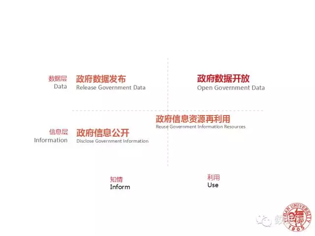 在這張表上,橫向是從知情到利用,縱向是從信息層到數(shù)據(jù)層。開放政府數(shù)據(jù)在右上角,要開放到數(shù)據(jù)層,并且保證社會對數(shù)據(jù)的利用。政府信息公開是為了保障知情權,開放的是信息層。一些政府網(wǎng)站上也發(fā)布了一些數(shù)據(jù),但這就像政府在大門上貼出一張告示,說這就是政府的數(shù)據(jù)分析結果,而政府數(shù)據(jù)開放是政府打開一個門,說這里面的數(shù)據(jù),你們可以拿去用。過去還提過政府信息資源再利用,這和開放數(shù)據(jù)的差別是數(shù)據(jù)資源只給自己指定的公司用,但這可能涉及到數(shù)據(jù)資源權利尋租的問題。開放數(shù)據(jù)應該是如果你把數(shù)據(jù)給了A,就也可以給B,只要B也滿足了基本條件。