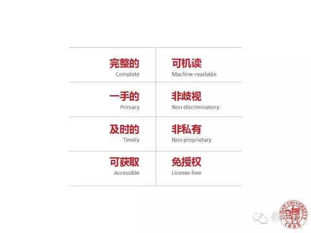 真正的開放數(shù)據(jù)要滿足以上這些標準。數(shù)據(jù)是完整的、原始的、一手的、及時的,可獲取的,有一個平臺可以讓我下載,而不是我私下里找你要,例如DATA.GOV這樣的平臺。開放數(shù)據(jù)是非歧視、非私有的,產(chǎn)權上來說這些數(shù)據(jù)屬于公共資源,并不屬于某個政府部門,而是屬于社會的公共資源。免授權,獲取過程中不再需要填一系列表格協(xié)議,就可以到網(wǎng)上下載,美國政府開放的數(shù)據(jù)我們中國人也可以去下載。