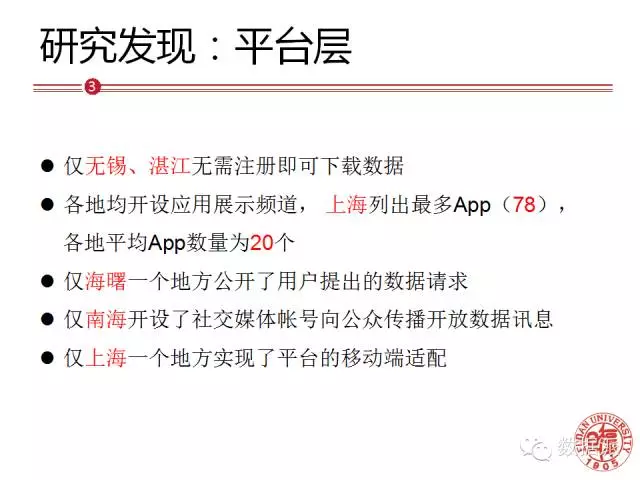 評估包括數(shù)據(jù)層和平臺層。各地平均公開了278個數(shù)據(jù)集。數(shù)據(jù)總量上看武漢是全國第一,但是武漢可機讀的數(shù)據(jù)只有一半,另外一半基本是PDF格式,不利于社會對數(shù)據(jù)的利用,不是真正的數(shù)據(jù)開放。
