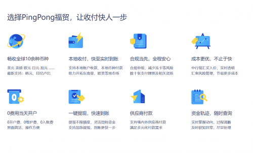 福貿(mào)是PingPong旗下的B2B一站式收付款產(chǎn)品,作為一站式外貿(mào)商綜合服務(wù)平臺,PingPong 福貿(mào)始終著眼于全球貿(mào)易市場,通過外貿(mào)B2B收款、全球分發(fā)、外匯管理等產(chǎn)品矩陣,為國際貿(mào)易鏈提供高效、可靠和低成本的綜合科技解決方案,全面構(gòu)建中國出海企業(yè)支付業(yè)務(wù)閉環(huán)。