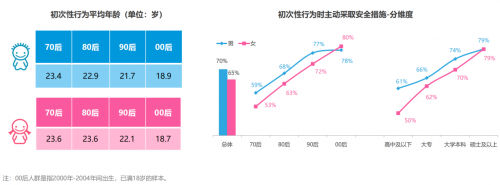 同樣顯著降低的還有“初次性 行為”平均年齡。《報(bào)告》顯示,“70后”男性為23.4歲,女性為23.6歲。隨后呈現(xiàn)逐漸走低的態(tài)勢(shì)。至“00后(18歲以上人群)”,已降至男性平均18.9歲,女性平均18.7歲。然而,雖然平均年齡在下降,但是人群整體“性安全意識(shí)”卻在不斷提升。在“初次性行為時(shí)主動(dòng)采取安全措施”的選項(xiàng)上,男性“70后”最低,為59%。隨即逐漸上升,至“00后”已達(dá)78%。而女性的自我保護(hù)意識(shí)則更加明顯,從“70后”的53%,大幅升至“00后”的80%,并且直接超越了男性占比。