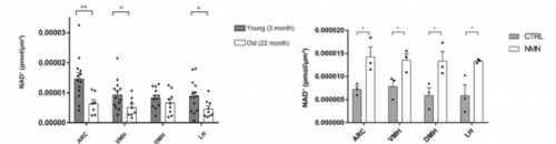 在NPJ Aging雜志上發(fā)表的一項新研究中,研究人員采用了一種新建立的方法來準確測量年輕和年老小鼠的下丘腦NAD+水平。表明,在下丘腦的四個測量子區(qū)域中的三個,NAD+ 水平顯著下降。因此,給22個月大的老年小鼠注射一次300 mg/kg NMN可恢復(fù)所有三個區(qū)域的NAD+水平。此外,研究人員發(fā)現(xiàn),用含有NAD+合成酶NAMPT的年輕小鼠的小囊泡注射老年小鼠,可將下丘腦中的NAD+水平提高近50%。