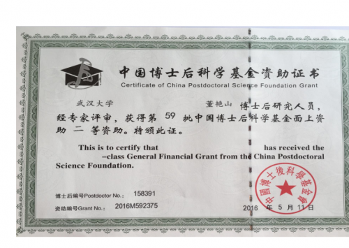 作為湖北真福醫(yī)藥研發(fā)團(tuán)隊(duì)人員之一的董艷山,獲此殊榮。武漢大學(xué)董艷山博士后研究人員,經(jīng)專家評審,活動第59批中國博士后科學(xué)基金面上資助二等資助。特頒發(fā)此證。