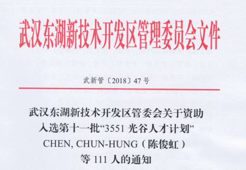 武漢東湖新技術(shù)開發(fā)區(qū)管委會關(guān)于資助入選第十一批“3551光谷人才計(jì)劃”CHEN,CHUN-HUNG(陳俊虹)等111人的通知。作為湖北真福醫(yī)藥研發(fā)團(tuán)隊(duì)人員之一的董艷山獲得資助入選計(jì)劃。