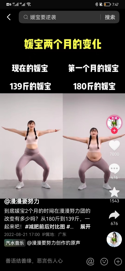 因為這次成功的減肥經歷,她也開始向網(wǎng)友分享健身知識。燃脂、塑身、增肌,各類健身視頻不一而足。總之,如果網(wǎng)友有健身的需求,總能在她的小視頻里找到合適的鍛煉動作?,F(xiàn)在“漫漫要努力”也開始在網(wǎng)上直播健身,帶著大家一起健身。她的短視頻里有一個叫做“媛寶”的小伙伴,跟著她一起鍛煉,3個月肉眼可見的瘦了下來。