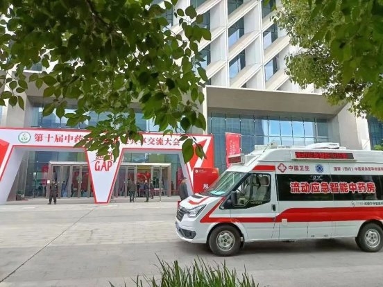 第十屆中藥材基地共建共享交流大會(huì)門口擺放的新綠色藥業(yè)“流動(dòng)應(yīng)急智能中藥房”