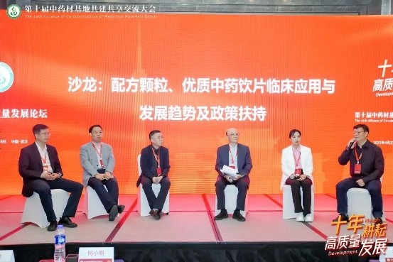 在沙龍環(huán)節(jié),由天津中醫(yī)藥大學(xué)第二附屬醫(yī)院院長(zhǎng)雒明池,上海中醫(yī)藥大學(xué)附屬龍華醫(yī)院院長(zhǎng)陳躍來,甘肅中醫(yī)院院長(zhǎng)張志明,山東中醫(yī)藥大學(xué)附屬醫(yī)院大學(xué)城醫(yī)院院長(zhǎng)賈新華,上海中藥行業(yè)協(xié)會(huì)執(zhí)行會(huì)長(zhǎng)、國(guó)家中藥材標(biāo)準(zhǔn)化與質(zhì)量評(píng)估創(chuàng)新聯(lián)盟副理事長(zhǎng)楊弘,新綠色藥業(yè)副總經(jīng)理王友利就“配方顆粒、優(yōu)質(zhì)中藥飲片臨床應(yīng)用與發(fā)展趨勢(shì)及政策扶植”展開討論。賈新華院長(zhǎng)向新綠色藥業(yè)在疫情期間作出的突出貢獻(xiàn)表示衷心的感謝,他特別提到去年上海疫情,新綠色藥業(yè)第 一時(shí)間遠(yuǎn)程調(diào)配“流動(dòng)應(yīng)急智能中藥房”,解決了封控期間用藥的問題。彰顯了新綠色藥業(yè)共克時(shí)艱,同心戰(zhàn)“疫”的責(zé)任與擔(dān)當(dāng)。新綠色藥業(yè)副總經(jīng)理王友利論述了中藥配方顆粒行業(yè)發(fā)展?fàn)顩r及目前存在的困境。