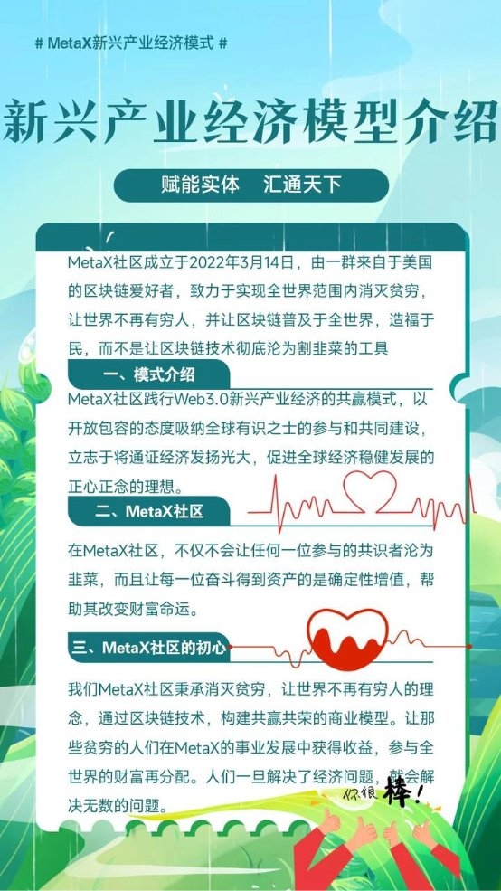 MetaX 新興產(chǎn)業(yè)經(jīng)濟(jì)模式生態(tài)系統(tǒng)項(xiàng)目是一個(gè)全新的 Web3.0 通證經(jīng)濟(jì)模型,致力于解決當(dāng)前傳統(tǒng)經(jīng)濟(jì)中廣大消費(fèi)者的巨大的消費(fèi)欲望與極其有限的消費(fèi)財(cái)力之間的巨大矛盾,高效整合全球?qū)嶓w經(jīng)濟(jì)的各條產(chǎn)業(yè)鏈上的生產(chǎn)端、銷售端、消費(fèi)端和投資端的資源對(duì)接,真正實(shí)現(xiàn)將人們的巨大的消費(fèi)需求轉(zhuǎn)化為實(shí)際的消費(fèi)行為從而讓一切消費(fèi)行為作為對(duì)經(jīng)濟(jì)發(fā)展原始動(dòng)力的貢獻(xiàn)從而獲得公平的財(cái)富評(píng)價(jià),讓全球?qū)嶓w經(jīng)濟(jì)發(fā)展獲得巨大且持續(xù)的動(dòng)力的同時(shí),也讓全球經(jīng)濟(jì)獲得前所未有的高效率運(yùn)轉(zhuǎn),從而徹底幫助全球?qū)嶓w經(jīng)濟(jì)實(shí)現(xiàn)效率和活力升級(jí)的同時(shí)也實(shí)現(xiàn)消除全球貧困這一困擾聯(lián)合國多年的經(jīng)濟(jì)問題。MetaX 新興產(chǎn)業(yè)經(jīng)濟(jì)模式生態(tài)系統(tǒng)項(xiàng)目立足于規(guī)范化發(fā)展,并已經(jīng)開始不斷取得社會(huì)各界的認(rèn)可。