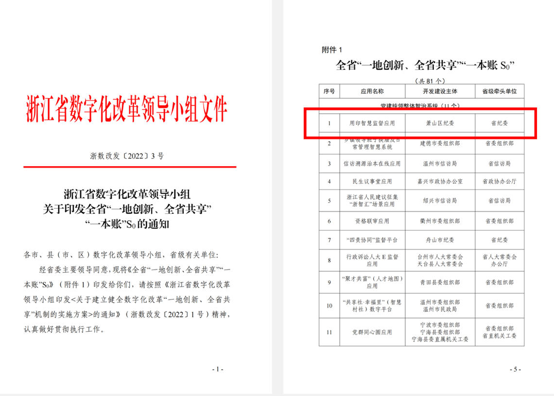 據(jù)浙江省數(shù)字化改革領(lǐng) 導(dǎo)小組文件通知,2022年,由群杰科技協(xié)同杭州市蕭山區(qū)紀(jì)委研發(fā)搭建的“用印智慧監(jiān)督應(yīng)用”系統(tǒng)入選浙江省“一地創(chuàng)新、全省共享”“一本帳”清單,列為“黨建統(tǒng)領(lǐng)整體智治系統(tǒng)”大項(xiàng)中的首位推介系統(tǒng),成為由浙江省紀(jì)委牽頭實(shí)施的浙江省數(shù)字化治理改革重點(diǎn)項(xiàng)目。截止到目前,以浙江省杭州市蕭山區(qū)義橋鎮(zhèn)為起點(diǎn),整個(gè)蕭山區(qū)的的鎮(zhèn)街、村社等皆已上線群杰智慧印章系統(tǒng),實(shí)現(xiàn)了印章的安全、高效、合規(guī)、智能管理。而在浙江省之外,山東、江蘇、湖南等多個(gè)地區(qū)的多個(gè)鄉(xiāng)鎮(zhèn)、村社,也正在通過群杰智慧印章系統(tǒng)加強(qiáng)印章管控。