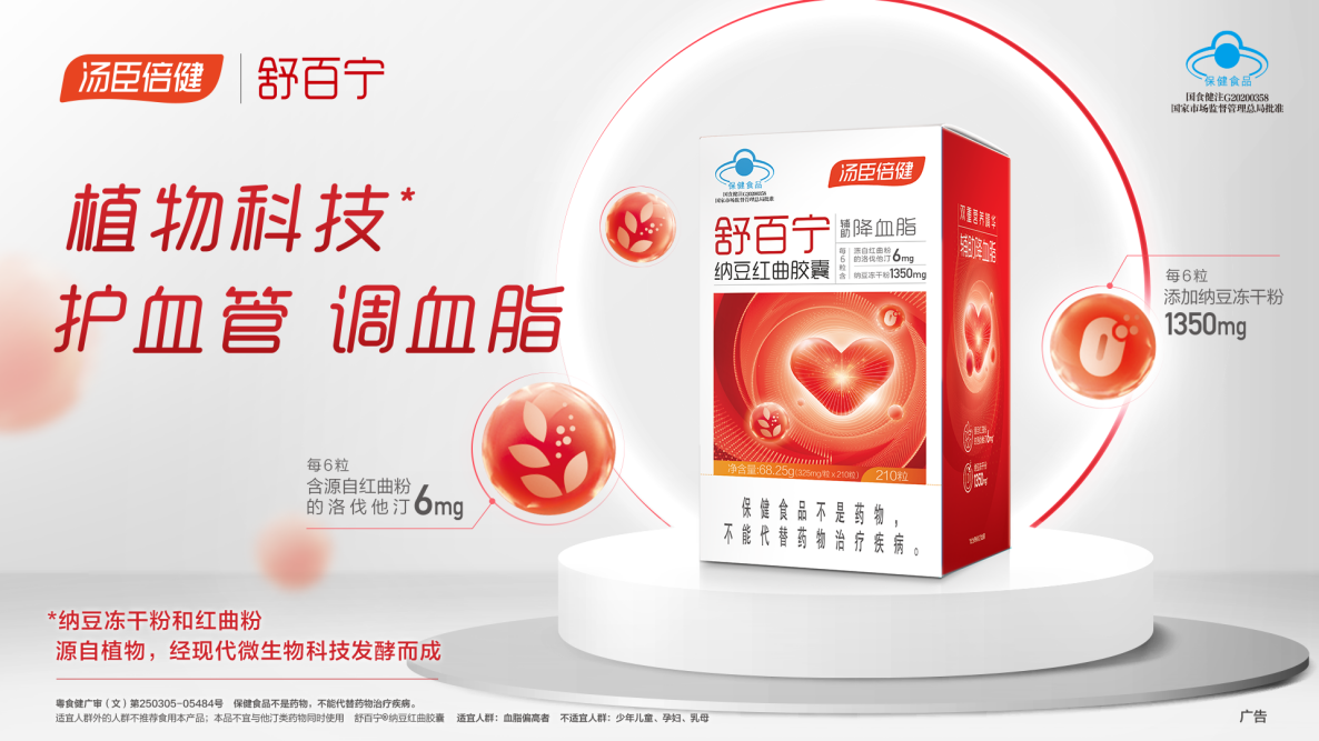 舒百寧納豆紅曲膠囊采用的就是納豆+紅曲這對(duì)王牌天然雙原料,用高溫+低溫雙重發(fā)酵工藝,能最 大限度保存原材料的活性成分,從而發(fā)揮更好的功效。舒百寧納豆紅曲膠囊不僅適合血脂血管類疾病患者服用,也適合高糖高脂飲食者、偏胖體重超標(biāo)者、常年應(yīng)酬煙酒不離者、年事逐高者等眾多群體服用,每日服用6粒,可補(bǔ)充源自紅曲的洛伐他汀6mg,納豆凍干粉1350mg,含納豆激酶2000FU/g,科學(xué)輔助降血脂,最 大程度呵護(hù)人體血管健康。