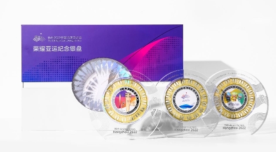 杭州第19屆亞運(yùn)會(huì)紀(jì)念銀盤共3枚,選取本屆亞運(yùn)會(huì)核心圖形作為設(shè)計(jì)元素,采用精密浮雕及高清彩印工藝,結(jié)合非遺花絲打造而成。三枚銀盤采用足銀聚寶盤造型,分別以杭州第19屆亞運(yùn)會(huì)會(huì)徽“潮涌”;吉祥物“琮琮”“宸宸”“蓮蓮”和亞運(yùn)會(huì)火炬“薪火”為主元素,設(shè)計(jì)新穎,采用造幣工藝和非遺花絲相結(jié)合,限量發(fā)行5000套。
