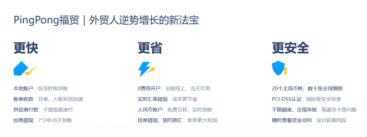 在此背景之下,進(jìn)一步挖掘外貿(mào)企業(yè)的數(shù)字化轉(zhuǎn)型高新技術(shù)賦能將成為我國外貿(mào)經(jīng)濟(jì)建設(shè)的關(guān)鍵步伐。而對此,PingPong福貿(mào)作為國內(nèi)外貿(mào)收付領(lǐng)域的數(shù)字先行者,充分發(fā)揮了自身強(qiáng)大的數(shù)字技術(shù)應(yīng)用能力和全球收付服務(wù)建設(shè)能力,打造了一站式數(shù)字化外貿(mào)收付款解決方案,致力為廣大中小外貿(mào)企業(yè)降低國際貿(mào)易成本,推動企業(yè)通過數(shù)字賦能在全球貿(mào)易競爭中具備強(qiáng)勁實(shí)力。