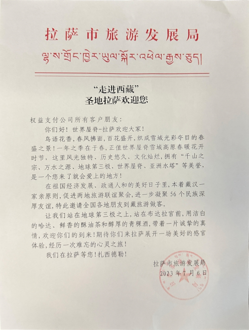 早在2023年7月6日,李藝凡老師及其權(quán)益支付團隊就收到了拉薩市旅游發(fā)展局的歡迎邀請。于是,在2023年8月下旬的時光中,李藝凡老師帶領(lǐng)權(quán)益支付團隊,踏上了前往西藏拉薩的公益行游學之旅。整個行程,持續(xù)七天六夜。李藝凡老師與其團隊,通過對當?shù)鼐包c進行參觀、對當?shù)夭孛襁M行家訪以及對當?shù)赜行枰娜诉M行扶貧濟困、捐贈等方式,實踐和推動了本次公益行游學之旅的進程和落地。