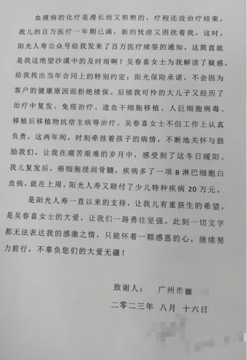 獲取病案資料后,工作人員再次協(xié)助梁女士提交少兒特定疾病的理賠申請,不到一個工作日,20萬元理賠金便順利支付至梁女士賬戶。在收到這份“意料之外”的理賠金后,梁女士特地從北京寄來了感謝信及錦旗,她說:“是陽光人壽一直以來的支持,讓我兒有重獲新生的希望,是陽光透過業(yè)務(wù)人員傳來的大愛,讓我們一路勇往前行。此刻一切文字都無法表達(dá)我的感激之情!”