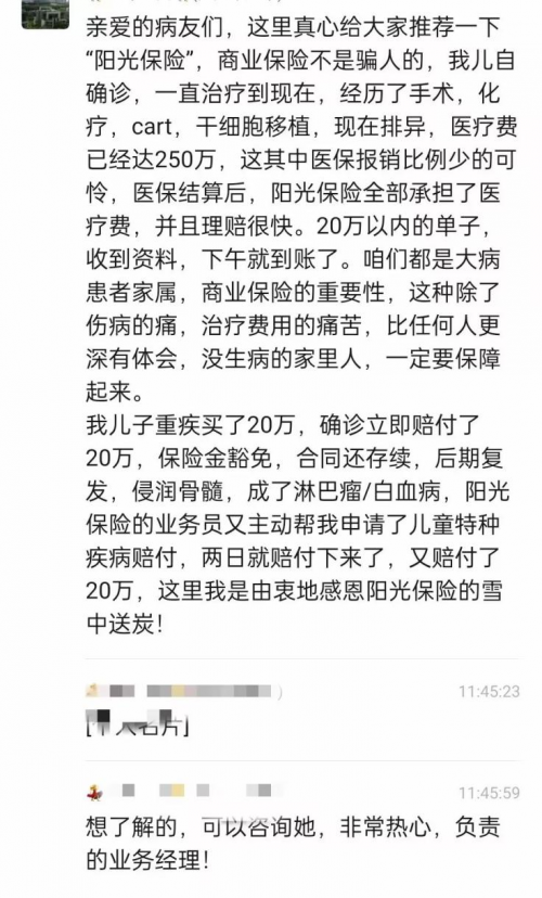 后續(xù),梁女士自發(fā)地在所在病友群推薦并夸贊了陽光人壽的產(chǎn)品和服務(wù)。