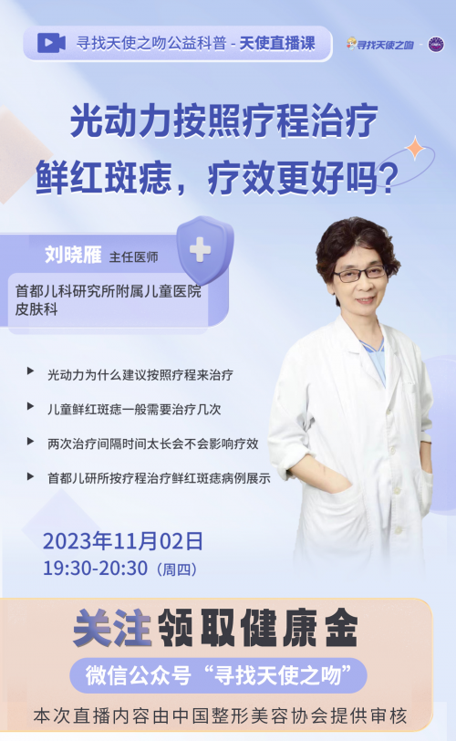 鮮紅斑痣紅友心里總有很多小問號。11月2日19:30-20:30,尋找天使之吻公眾號“天使直播課”公益欄目邀請首都兒科研究所附屬兒童醫(yī)院皮膚科劉曉雁主任,開展了以“光動力按照療程治療鮮紅斑痣療效更好嗎”為主題的科普直播,為廣大紅友答疑解惑。
