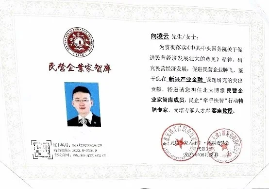 為貫徹落實《關(guān)于促進民營經(jīng)濟發(fā)展壯大的意見》精神,研究民營經(jīng)濟發(fā)展,促進民營企業(yè)騰飛,鑒于向凌云先生在新興產(chǎn)業(yè)金融課題研究的突出貢獻,特邀請擔任北大博雅民營企業(yè)家智庫成員,民企“牽手扶智”行動特聘專家,元培專家人才庫客座教授。