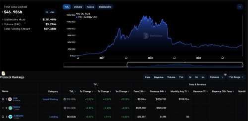 2023年DeFi在總鎖倉價(jià)值上呈現(xiàn)平穩(wěn)態(tài)勢,截止本文發(fā)布,有470億美元的價(jià)值被鎖定在DeFi合約中,較2022年12月31日的380億美元上升了23.6%。