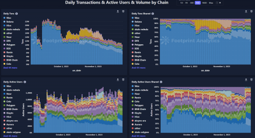 從具體的生態(tài)來看,目前整個(gè)市場的日活地址數(shù)超百萬,絕對流量集中在Wax鏈上。 得益于其低廉的交互成本和快捷的結(jié)算體驗(yàn),Wax歷經(jīng)牛熊仍然保持了其最高的市場占有率地位, 其他的公鏈如Near、Celo和Polygon等也有一定的市場占有率。