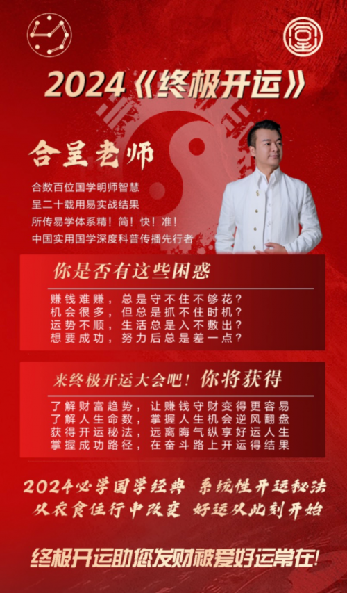合呈老師的終極開(kāi)運(yùn)課程系列,是他的智慧結(jié)晶,也是他對(duì)國(guó)學(xué)文化深入研究的體現(xiàn)。這一課程系列主要包含年關(guān)開(kāi)運(yùn)系列、節(jié)氣開(kāi)運(yùn)系列和日常生活開(kāi)運(yùn)系列三大部分,全方位地涵蓋了人民日常行為的方方面面。無(wú)論是通過(guò)服裝、出行、風(fēng)水等方法來(lái)尋時(shí)借運(yùn),還是分析每月的能量趨勢(shì),合呈老師都有獨(dú)到的見(jiàn)解和實(shí)戰(zhàn)的經(jīng)驗(yàn)分享。