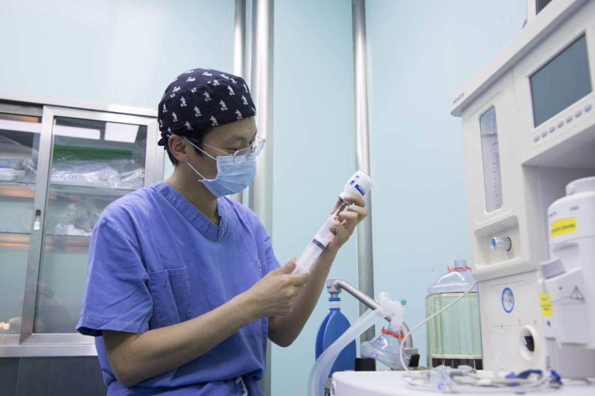 工作中的郭主任總是穿著藍(lán)色短袖的手術(shù)服,頭戴簡(jiǎn)樸的手術(shù)帽,腳踏著專(zhuān)用的消毒拖鞋,他的雙手因?yàn)轭l繁洗滌和消毒而顯得格外白皙。沒(méi)有醫(yī)生那典型的白大褂作為標(biāo)志,而那溫暖親切的笑容,常常被口罩輕輕遮掩。在每一場(chǎng)手術(shù)中,總能見(jiàn)到他的身影。他肩負(fù)著讓求美者在手術(shù)中幾乎感受不到痛苦的重任。他就是在手術(shù)室無(wú)影燈下默默守護(hù)著求美者生命安全的“幕后英雄”和“守護(hù)神”,他用自己的專(zhuān)業(yè)知識(shí)和無(wú)畏精神,為求美者構(gòu)筑起一道堅(jiān)固的保護(hù)屏障。