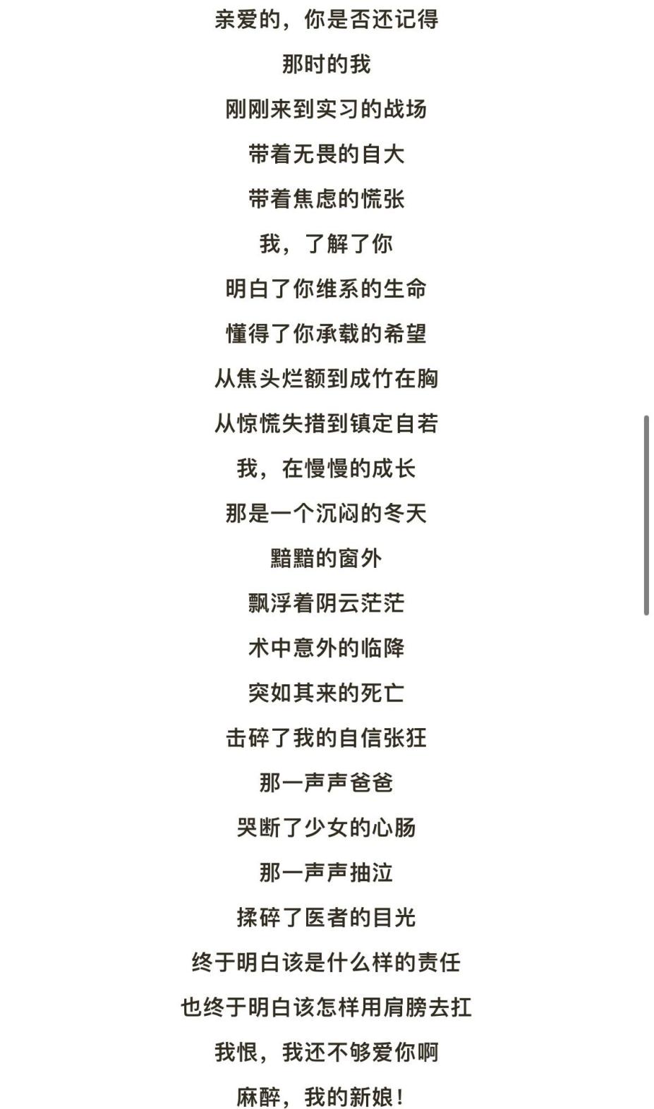 在郭晨主任的世界里,醫(yī)學(xué)不僅是科學(xué),也是藝術(shù),正如他鐘愛(ài)的詩(shī)歌一般。在手術(shù)室的嚴(yán)謹(jǐn)和緊張之余,郭主任常在詩(shī)中尋找慰藉和靈感。他熱愛(ài)寫(xiě)詩(shī),用文字描繪麻醉工作中的微妙情感和深刻體悟。他的詩(shī)句中,充滿(mǎn)了對(duì)生命的贊美和對(duì)工作的熱愛(ài),詩(shī)意般的語(yǔ)言,不僅表達(dá)了他對(duì)麻醉學(xué)科的深厚情感,也展現(xiàn)了他作為醫(yī)生的人文關(guān)懷和藝術(shù)氣質(zhì)。