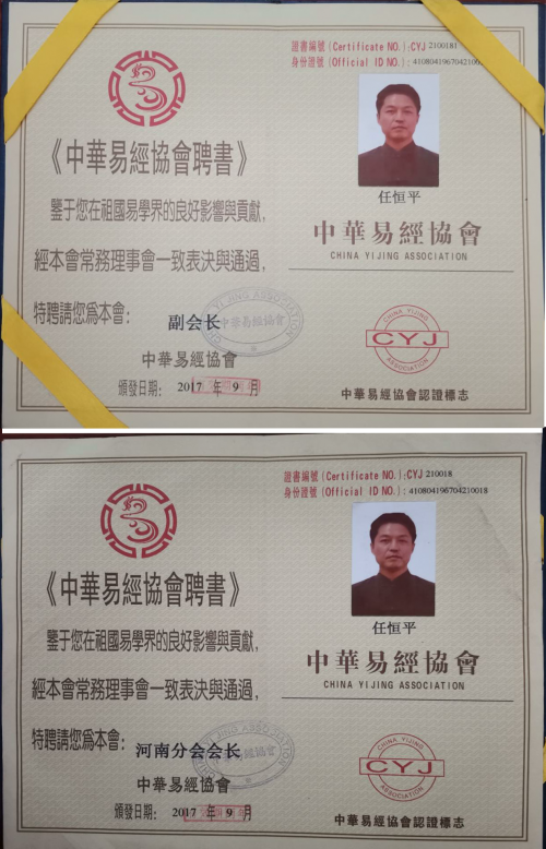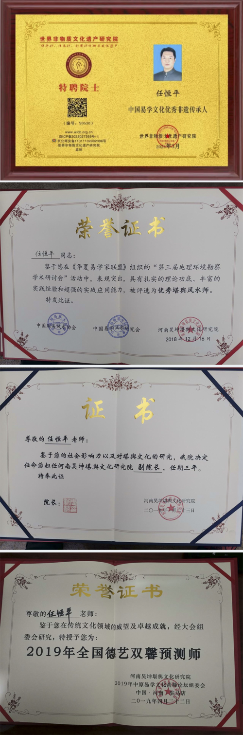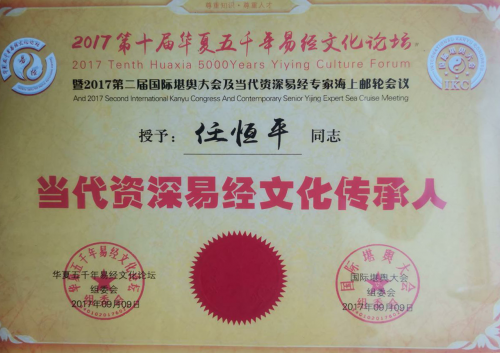 任恒平自1988年高校畢業(yè)參加政府工作后,在家傳易學(xué)文化基礎(chǔ)上,遍尋全國人杰圣地相繼拜訪名師高人,在持續(xù)頓悟中深入感念易經(jīng)文化的淵博和神奇,1997年開始全力于傳承學(xué)習(xí)和弘揚(yáng)國學(xué)傳統(tǒng)易經(jīng)文化,2007年8月經(jīng)授業(yè)恩師首肯授學(xué),2015年11月被中國易經(jīng)協(xié)會(huì)評(píng)為中國易經(jīng)當(dāng)代實(shí)力派命理風(fēng)水實(shí)戰(zhàn)專家和高級(jí)命理師,2017年3月創(chuàng)立河南道知易文化傳播有限公司,2017年9月被第十屆華夏五千年易經(jīng)文化論壇評(píng)為華夏五千年文化當(dāng)代資深易經(jīng)文化傳承人,同月?lián)沃腥A易經(jīng)協(xié)會(huì)副會(huì)長、河南省分會(huì)會(huì)長,2018年7月主辦中易協(xié)第二屆中國傳統(tǒng)文化正能量峰會(huì),擔(dān)任組委會(huì)主 席,被大會(huì)授予中國易文化學(xué)術(shù)成就獎(jiǎng),2018年10月被河南省易經(jīng)研究會(huì)評(píng)為優(yōu)秀命理專家,并擔(dān)任河南省易經(jīng)研究會(huì)理事,2018年12月華夏易學(xué)家聯(lián)盟第三屆地理環(huán)境勘察學(xué)術(shù)研討會(huì)評(píng)委“優(yōu)秀堪輿師”,同月加入中國道教正一派,2019年4月被中原第二屆高峰論壇組委會(huì)評(píng)為“德藝雙馨”預(yù)測(cè)師,2019年1月受邀擔(dān)任河南昊坤堪輿文化研究院副院長,2023年10月受邀擔(dān)任河南國易生命科學(xué)研究院特聘科學(xué)優(yōu)生高級(jí)院士,2024年1月26日創(chuàng)立任恒平生命科學(xué)(福建)研究院,并擔(dān)任院長,2024年3月受邀擔(dān)任世界非物質(zhì)文化遺產(chǎn)研究院特聘院士。