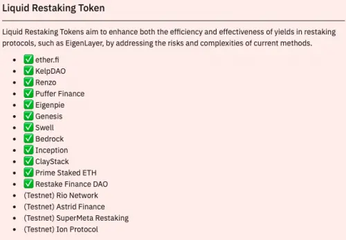 ? Liquid-LSD Restaking:將用戶質(zhì)押的LST統(tǒng)一管理放入Eigenlayer等外部Restaking協(xié)議,用戶則得到抵押憑證代幣 Liquid Restaking Token (LRT) (這類協(xié)議有KelpDAO、Restake Finance、Renzo)。這類協(xié)議同質(zhì)化嚴(yán)重,技術(shù)和創(chuàng)新性有限。