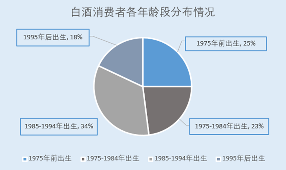 據(jù)中國(guó)酒業(yè)協(xié)會(huì)發(fā)布的《2023年中國(guó)白酒行業(yè)消費(fèi)白皮書(shū)》顯示,白酒消費(fèi)者中,1975年前出生的人群占比為25%;1975-1984年出生的人群占比23%;1985-1994年出生的人群逐步承接“85前”人群,成為新的白酒消費(fèi)主力,占比達(dá)到34%,而“95后”人群(不含未滿(mǎn)18周歲的人群),人群占比為18%。