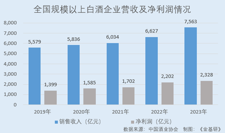 據(jù)中國(guó)酒業(yè)協(xié)會(huì)數(shù)據(jù),2019-2023年,國(guó)內(nèi)規(guī)模以上白酒企業(yè)實(shí)現(xiàn)銷(xiāo)售收入分別為5,579億元、5,836億元、6,034億元、6,627億元、7,563億元;實(shí)現(xiàn)利潤(rùn)總額分別為1,399億元、1,585億元、1,702億元、2,202億元、2,328億元,均呈逐年上漲趨勢(shì)。預(yù)測(cè)2024年國(guó)內(nèi)白酒行業(yè)總銷(xiāo)售額將達(dá)到8,000億元,同比增長(zhǎng)約10%。