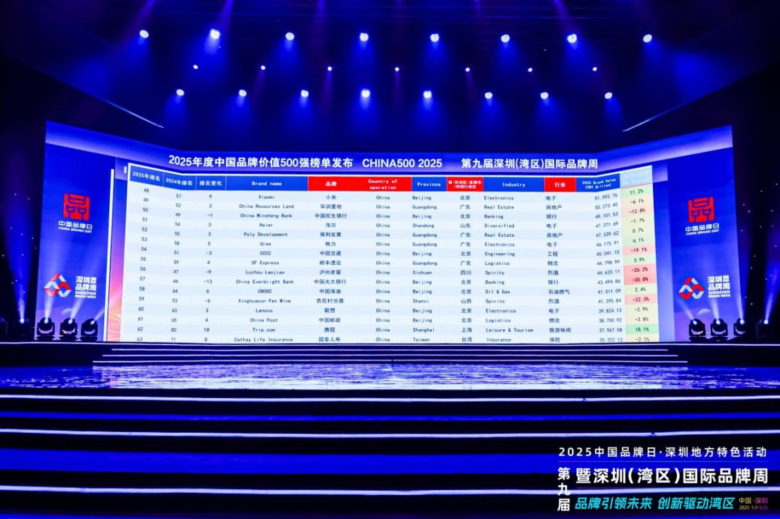 5月9日下午舉行的第九屆“深圳(灣區(qū))國際品牌周”主場活動——2025粵港澳大灣區(qū)質量品牌峰會上,每年在達沃斯世界經濟論壇年會上發(fā)布全球品牌價值500強的國際著名品牌價值評估咨詢機構Brand Finance,聯合深圳工業(yè)總會獨家發(fā)布了“2025中國品牌價值500強”中英文榜單。