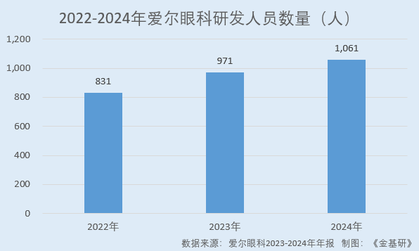 2022-2024年,愛爾眼科研發(fā)人員數(shù)量分別為831人、971人、1,061人,呈逐年增長趨勢。