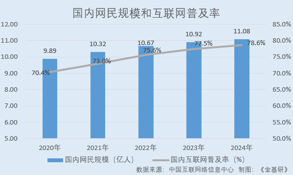 隨著移動互聯(lián)網(wǎng)時代的到來,國內(nèi)網(wǎng)民規(guī)模持續(xù)增長。據(jù)中國互聯(lián)網(wǎng)絡信息中心數(shù)據(jù),2020-2024年,國內(nèi)網(wǎng)民數(shù)量分別為9.89億人、10.32億人、10.67億人、10.92億人、11.08億人,國內(nèi)互聯(lián)網(wǎng)普及率分別為70.4%、73.0%、75.6%、77.5%、78.6%。