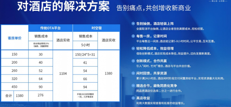 對(duì)于酒店,從“支付高傭金”到“0傭金入駐”,酒店無(wú)需向平臺(tái)支付費(fèi)用,可將部分閑置房間做置換,為酒店降本增效。通過(guò)時(shí)空宿平臺(tái)售出的房間,酒店獲得100%的房費(fèi)收入,淡季的空置房可以轉(zhuǎn)化為“時(shí)間資產(chǎn)”,合理分配閑置資源,用來(lái)吸引平臺(tái)用戶,而且平臺(tái)只服務(wù)于同區(qū)域同品質(zhì)的一半房源,可以更加精準(zhǔn)的獲得新客源。