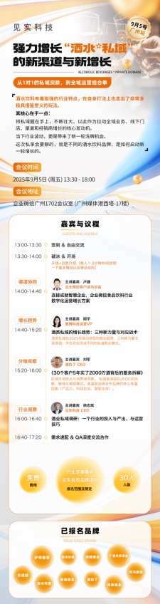 若您想更深度探討酒水私域新增長與全域運營落地思路,可關(guān)注 9 月 5 日(本周五) 由慧博科技聯(lián)合見實舉辦的強力增長“酒水 * 私域”的新渠道與新增長 私享會將在廣州開展。現(xiàn)場嘉賓將為與會嘉賓拆解酒飲私域增長玩法和全域?qū)崙?zhàn)案例;活動限時免費參加,先到先得,關(guān)注【北京慧博科技】公眾號進行報名